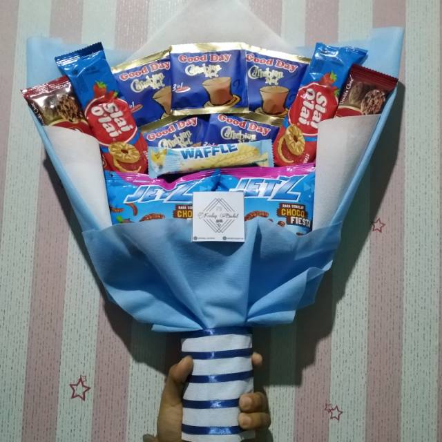 Kini kamu bisa beli Buket Snack. Jika biasanya buket diisi dengan bunga maka kini kamu bisa berkreasi dengan snack favorit orang yang akan kamu hadiahi Ladies. Tentu saja tidak bisa dibawa dengan mudah karena tidak bisa digenggam.
