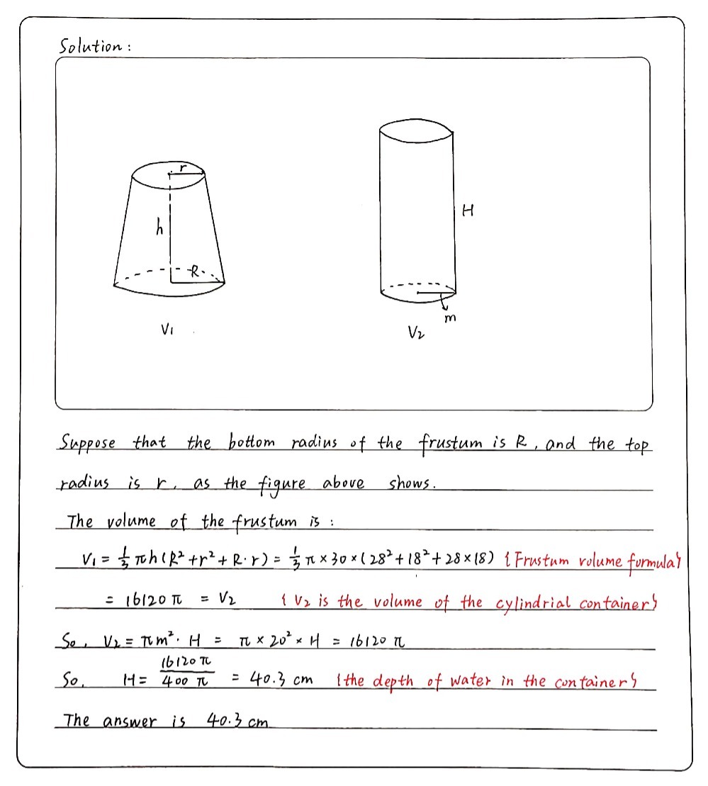 Please scroll down to see the correct answer and solution guide. The radii of the top and bottom are 28cm and 21cm respectively. The shaded part is full of sand.